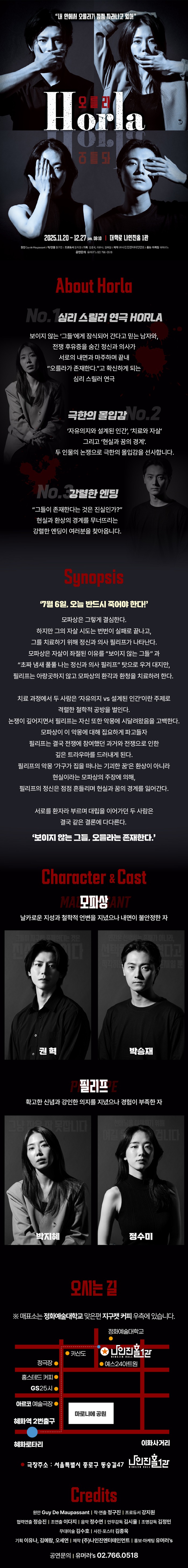 | 공연장르 | 연극(스릴러), [추가분류] 초연 | ||||||||||||||||||||||||||||||||||||||||||||||||||||||