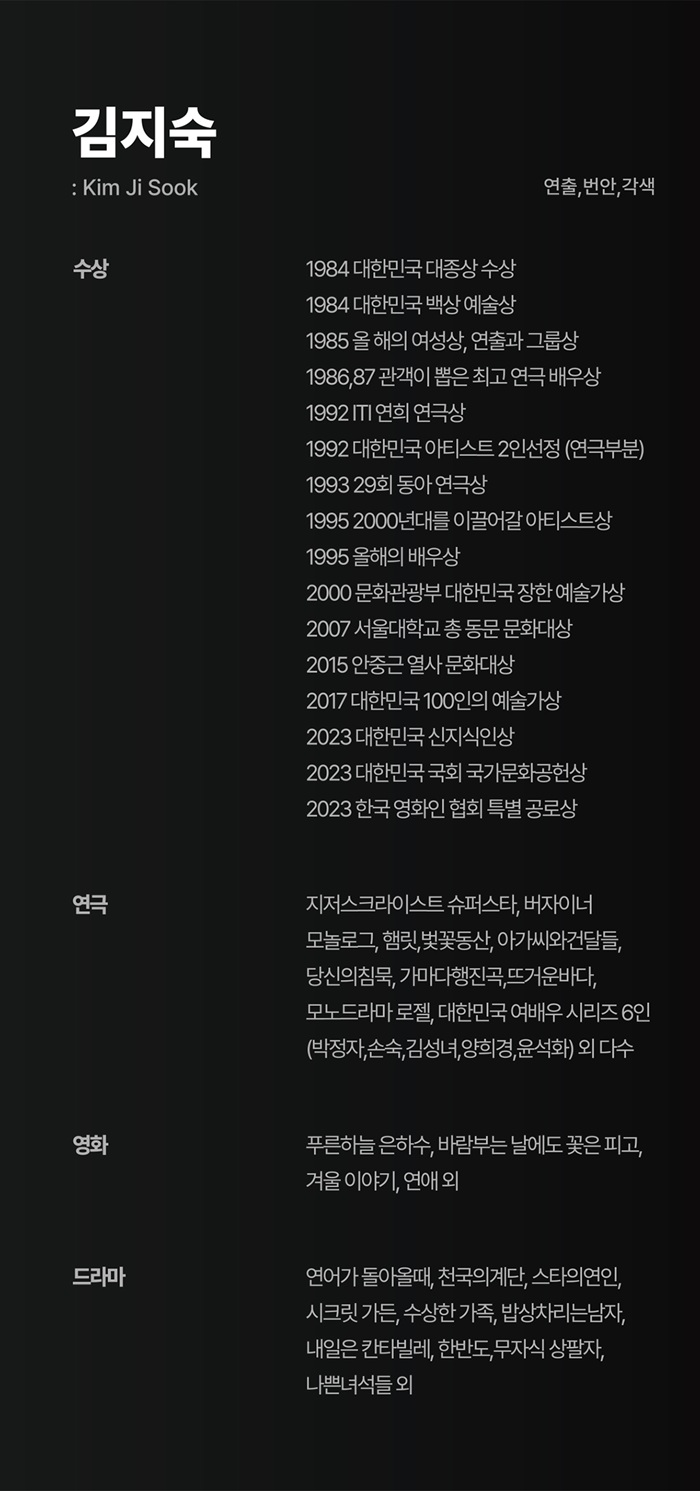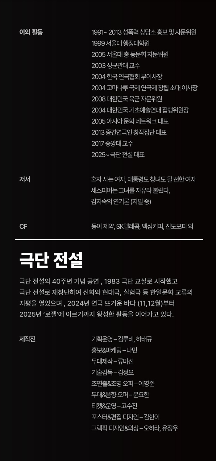 | 제작 | 극단 전설 | ||||||||||||||||||||||||||||||||||||||||||||||||||||||