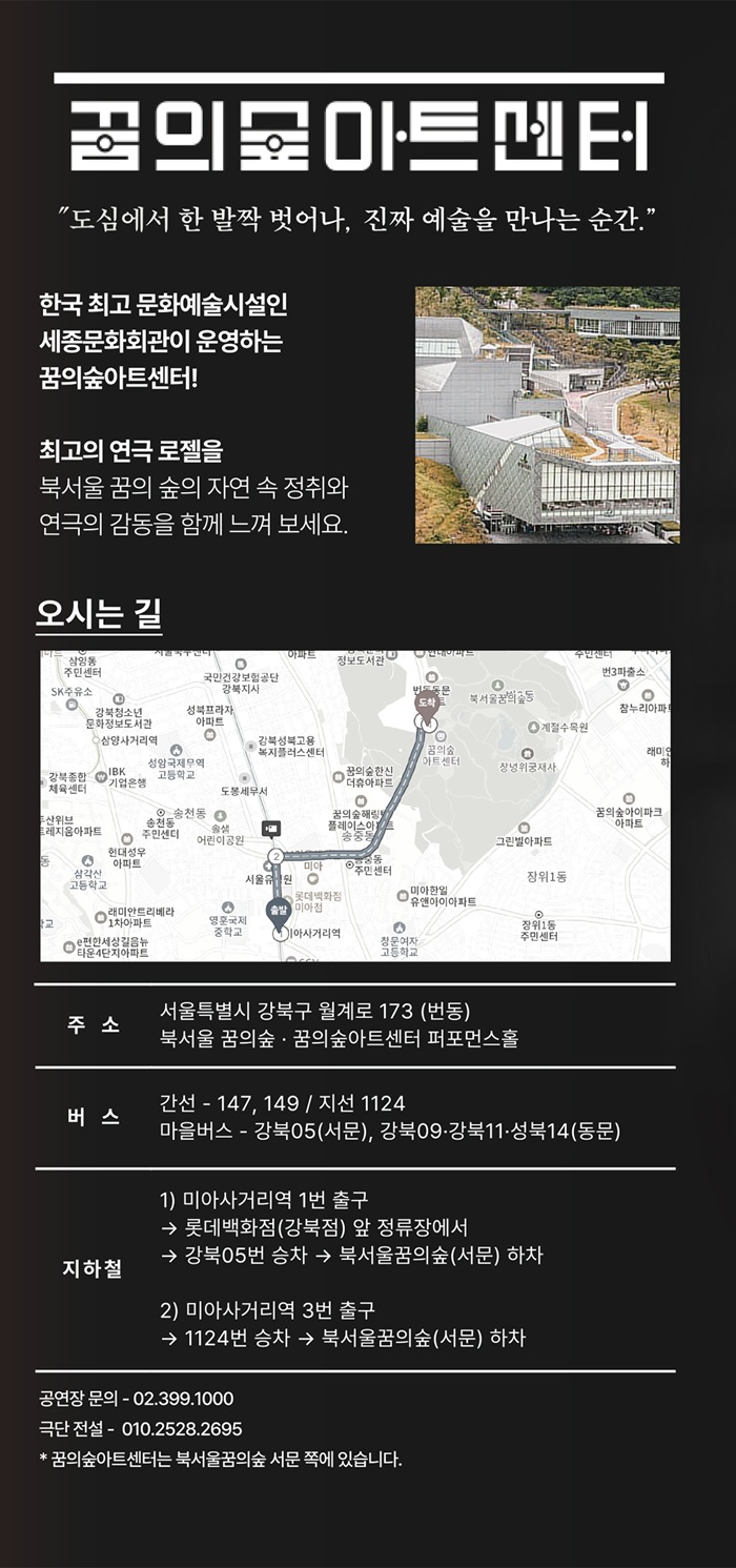 | 공연장소 | 꿈의숲아트센터 퍼포먼스홀 | ||||||||||||||||||||||||||||||||||||||||||||||||||||||