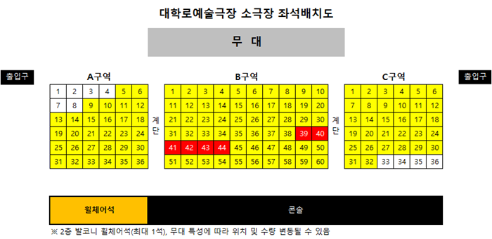 예매하신 순서에 따라 아래 좌석배치도의 노란색 좌석으로 지정됩니다.